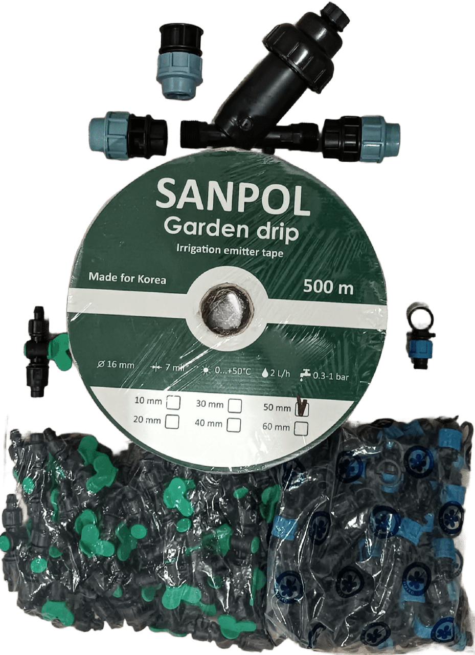 Набір призначений для організації крапельного поливання, що дає змогу ефективно та економно (irrigate) рослини, забезпечуючи їм необхідну кількість вологи. Усі фітинги та деталі адаптовані для роботи з ПЕТ трубами, що забезпечує простоту встановлення та надійність системи.